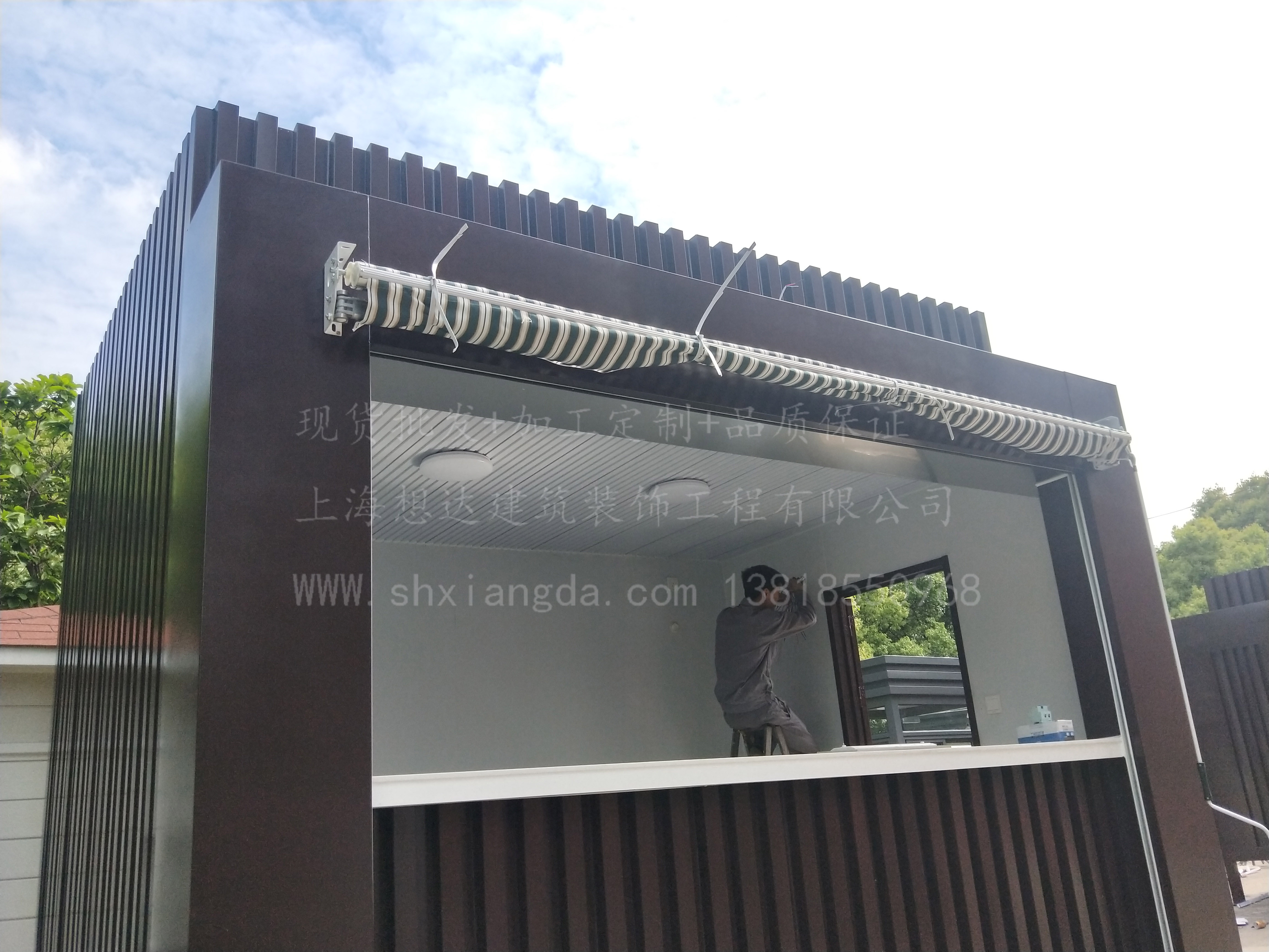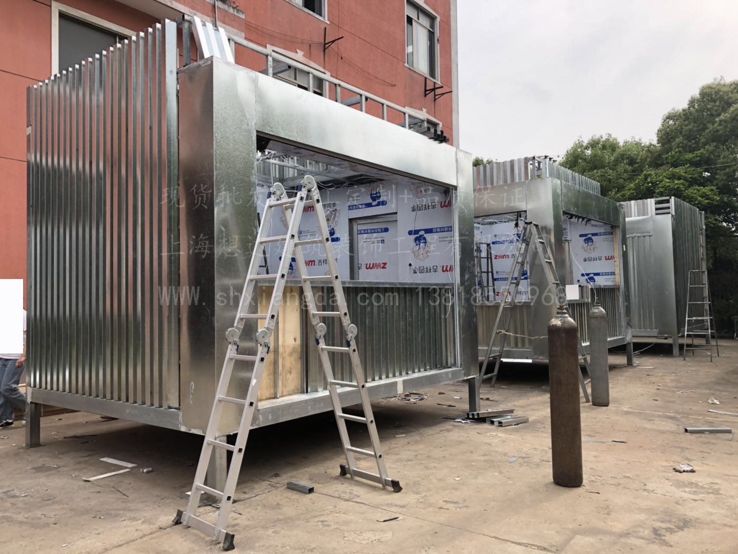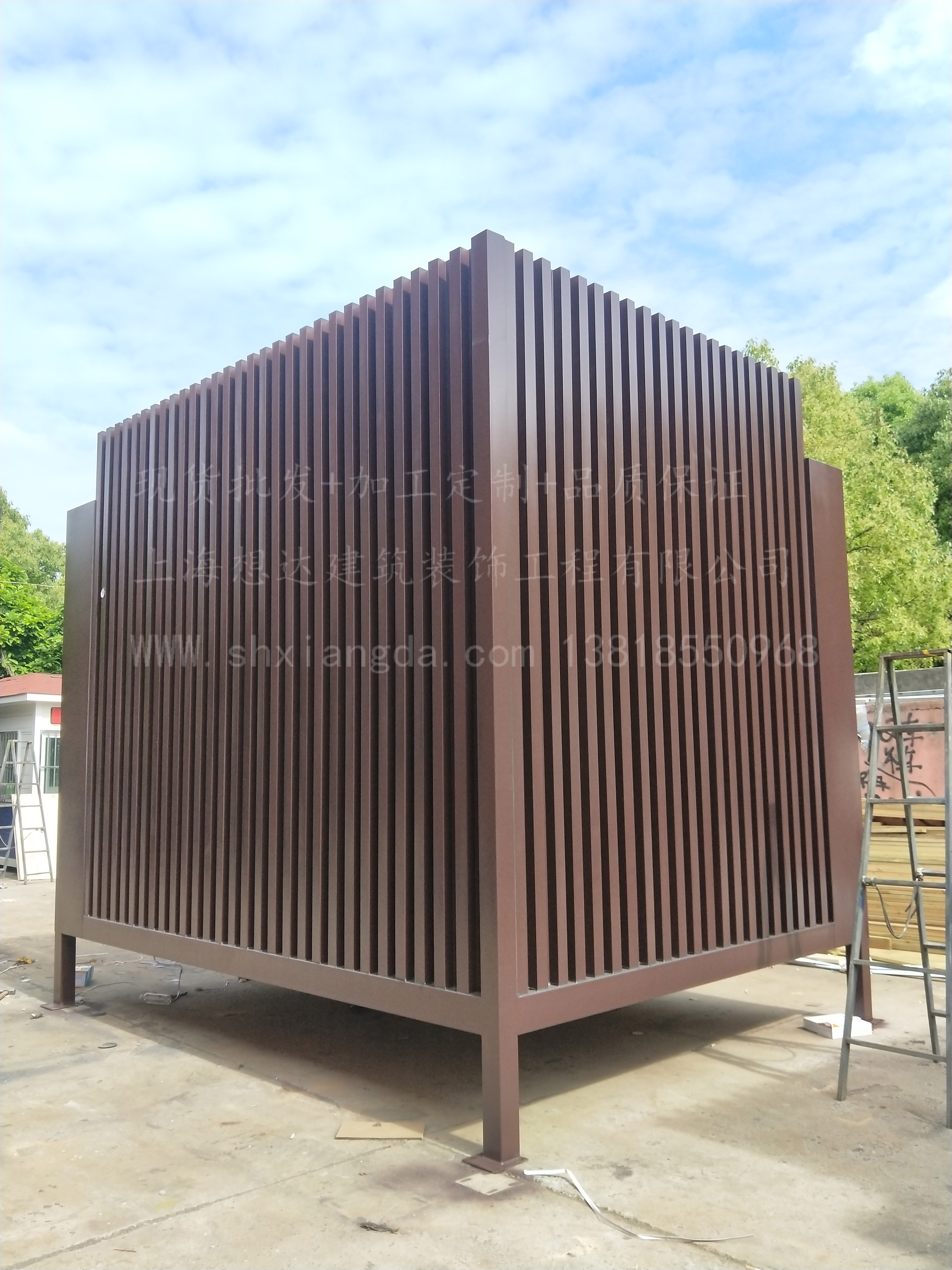 立柱采用100*100*2.5d鍍鋅方管焊接而成,整體鋼結(jié)構(gòu)骨架,抗震防風(fēng)。外墻采用鍍鋅板折邊成型,內(nèi)搭3mm鋁塑板,吊頂為16mm金屬烤漆雕花板吊頂。