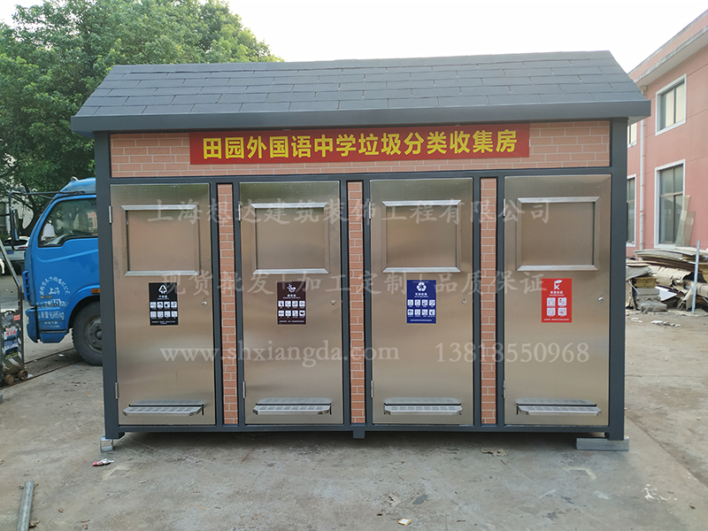 開學季來了,各大學校的配套設施都安排起來了,上海市閔行區田園外國語中學四分類環保垃圾房由上海想達建筑裝飾工程有限公司提供,并且安裝到位。